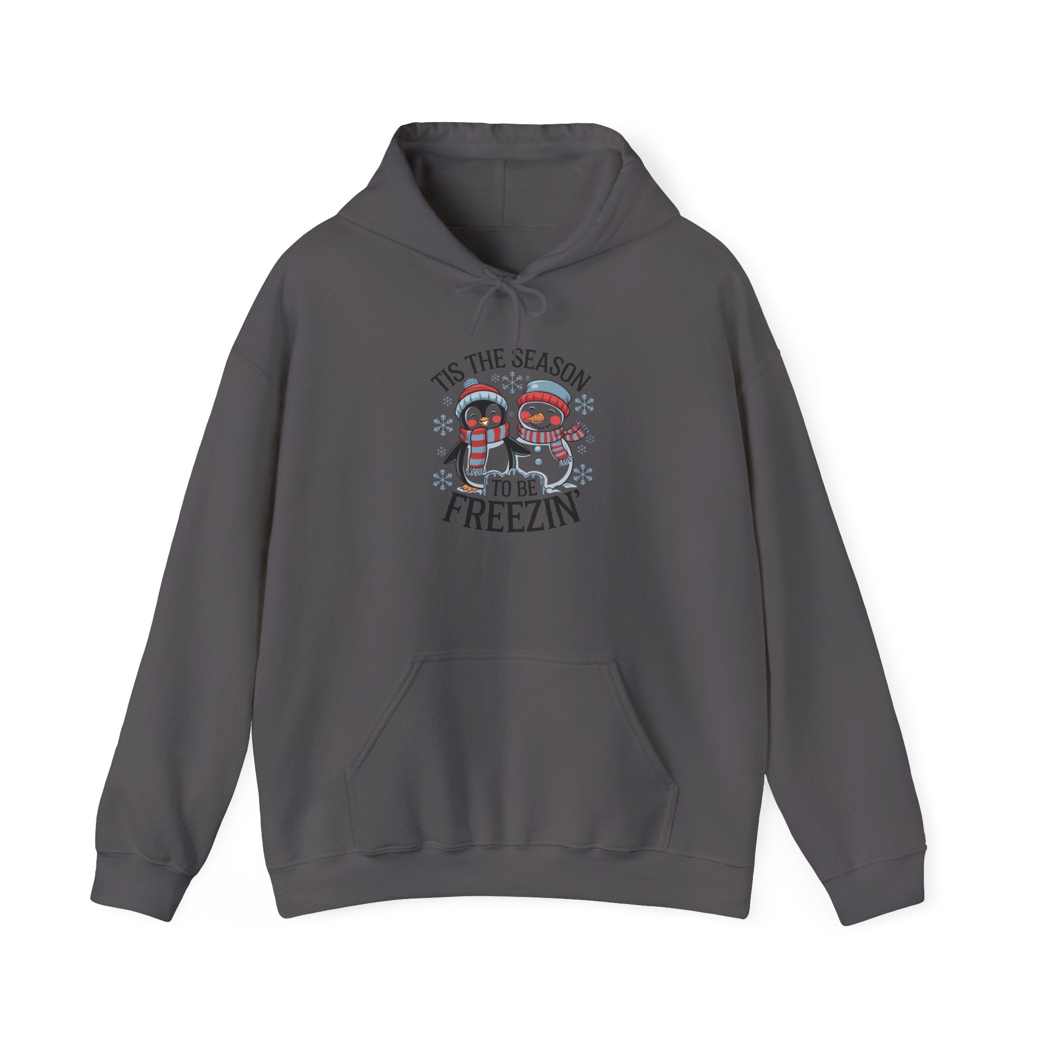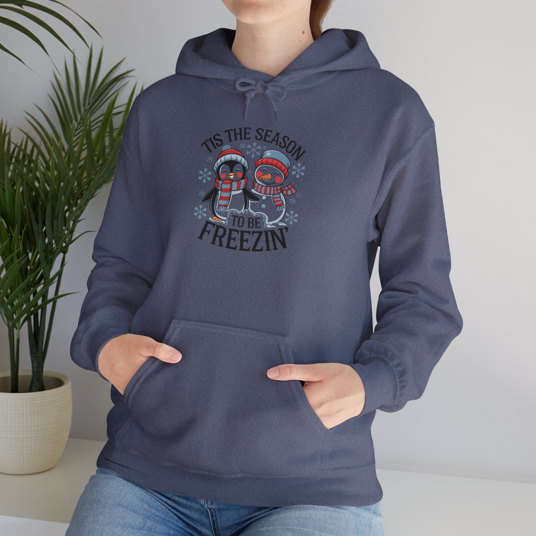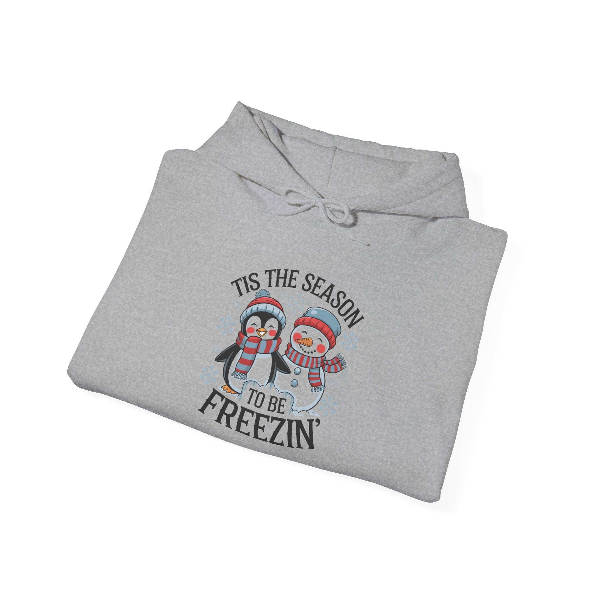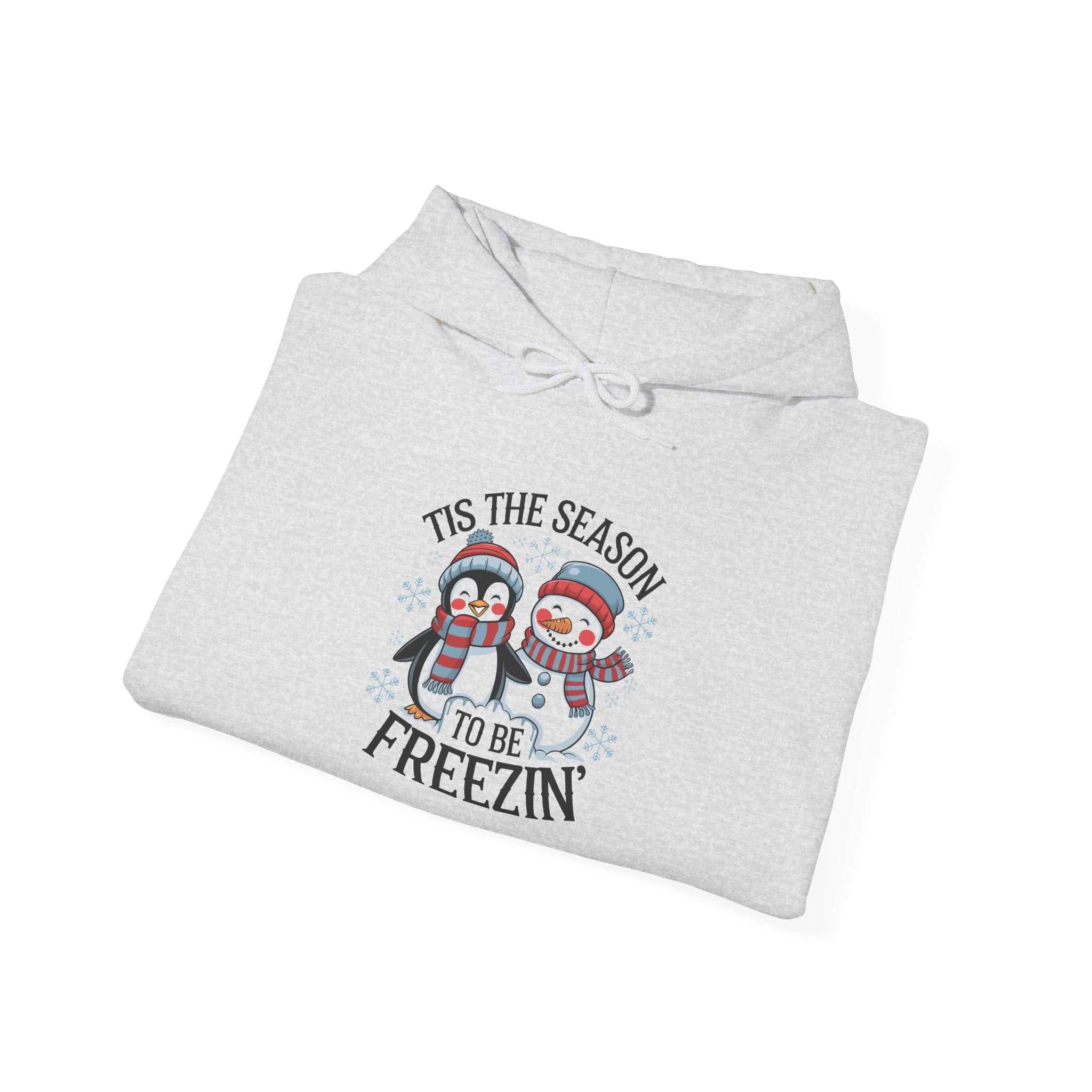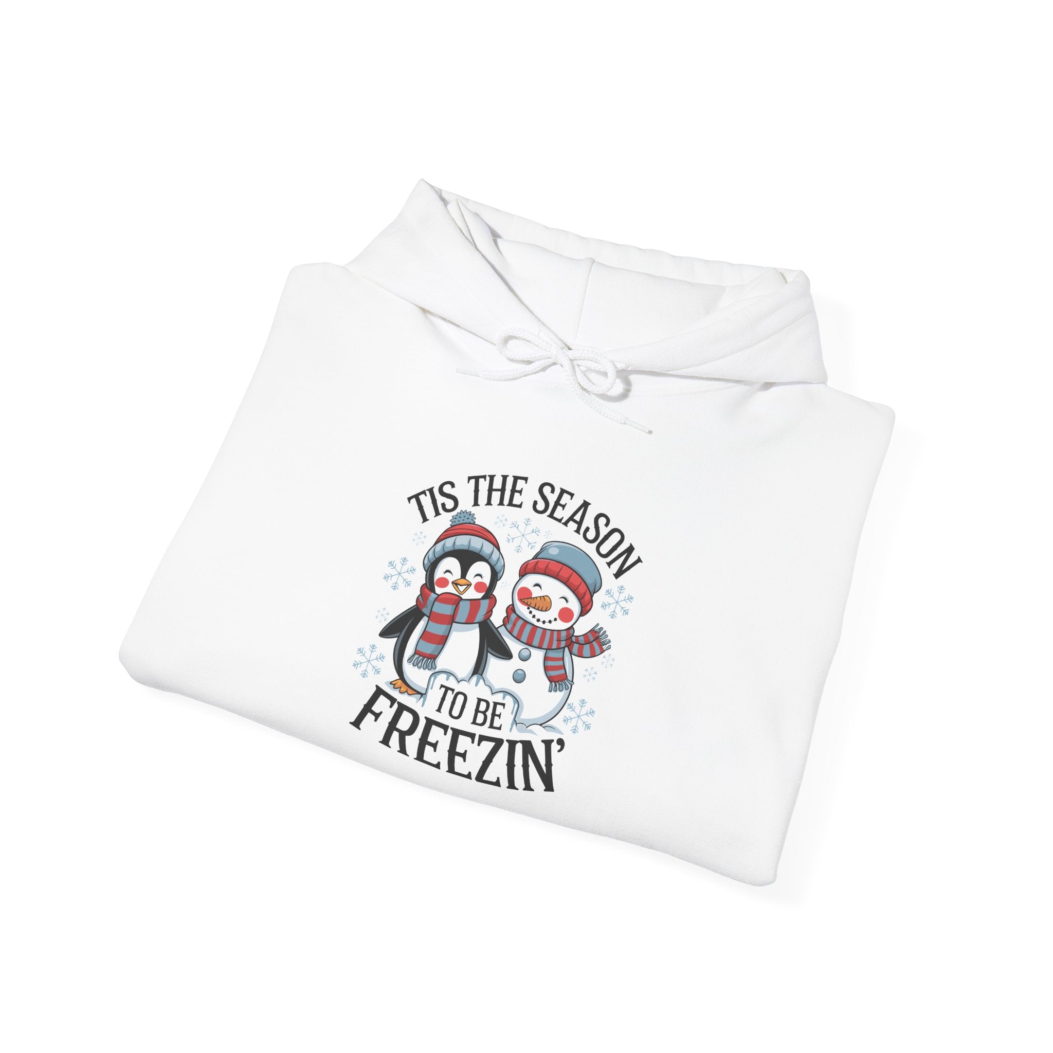 Embrace the frosty fun with our Tis the Season to Be Freezin’ Hoodie! This cheerful design features a bundled-up penguin and snowman surrounded by snowflakes, with playful text above and below them. Perfect for staying warm during winter festivities, this hoodie makes a great holiday gift for anyone who loves cute and cozy Christmas vibes.