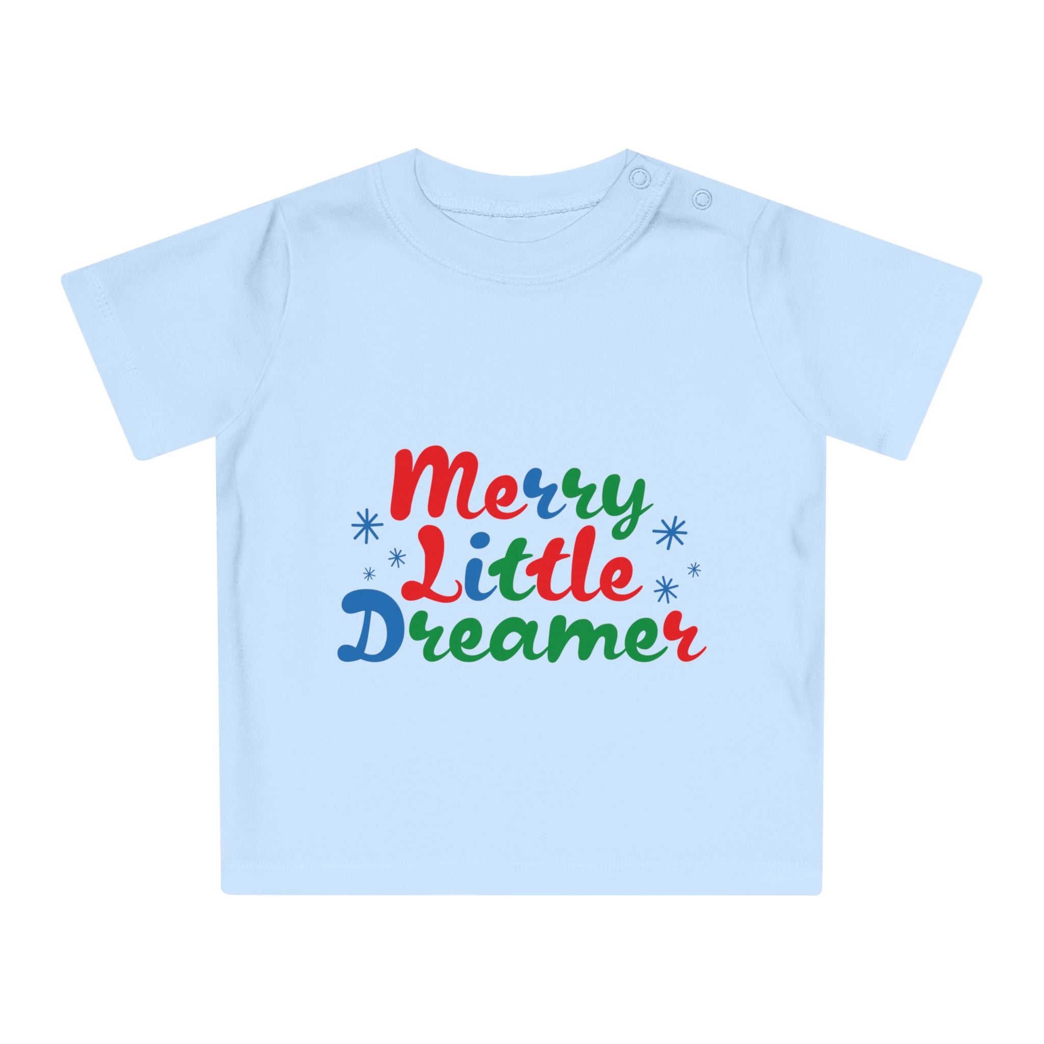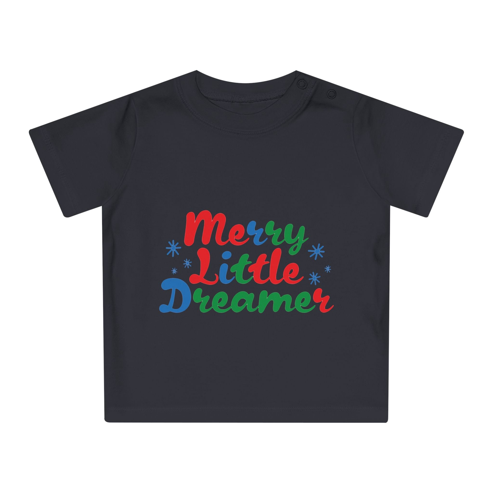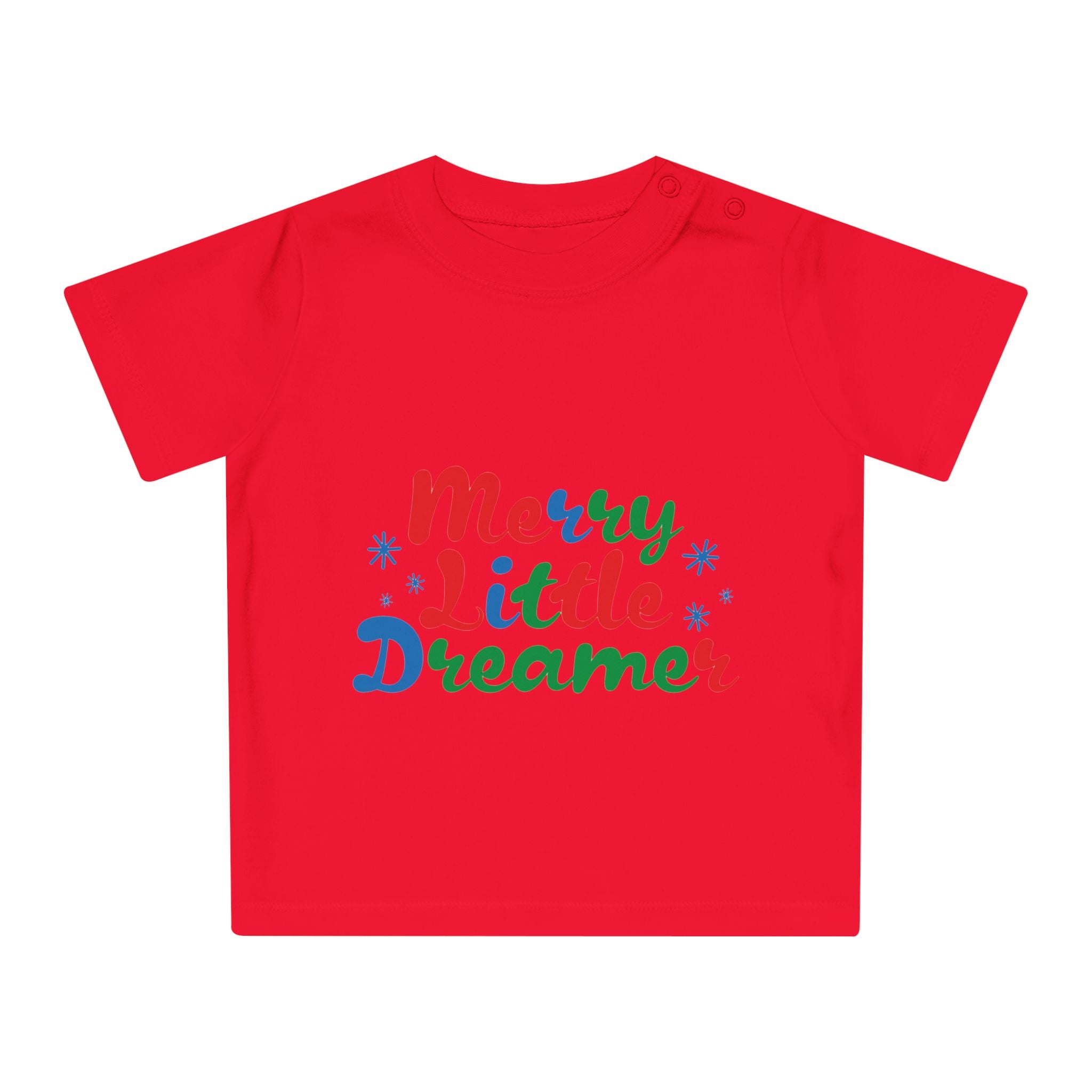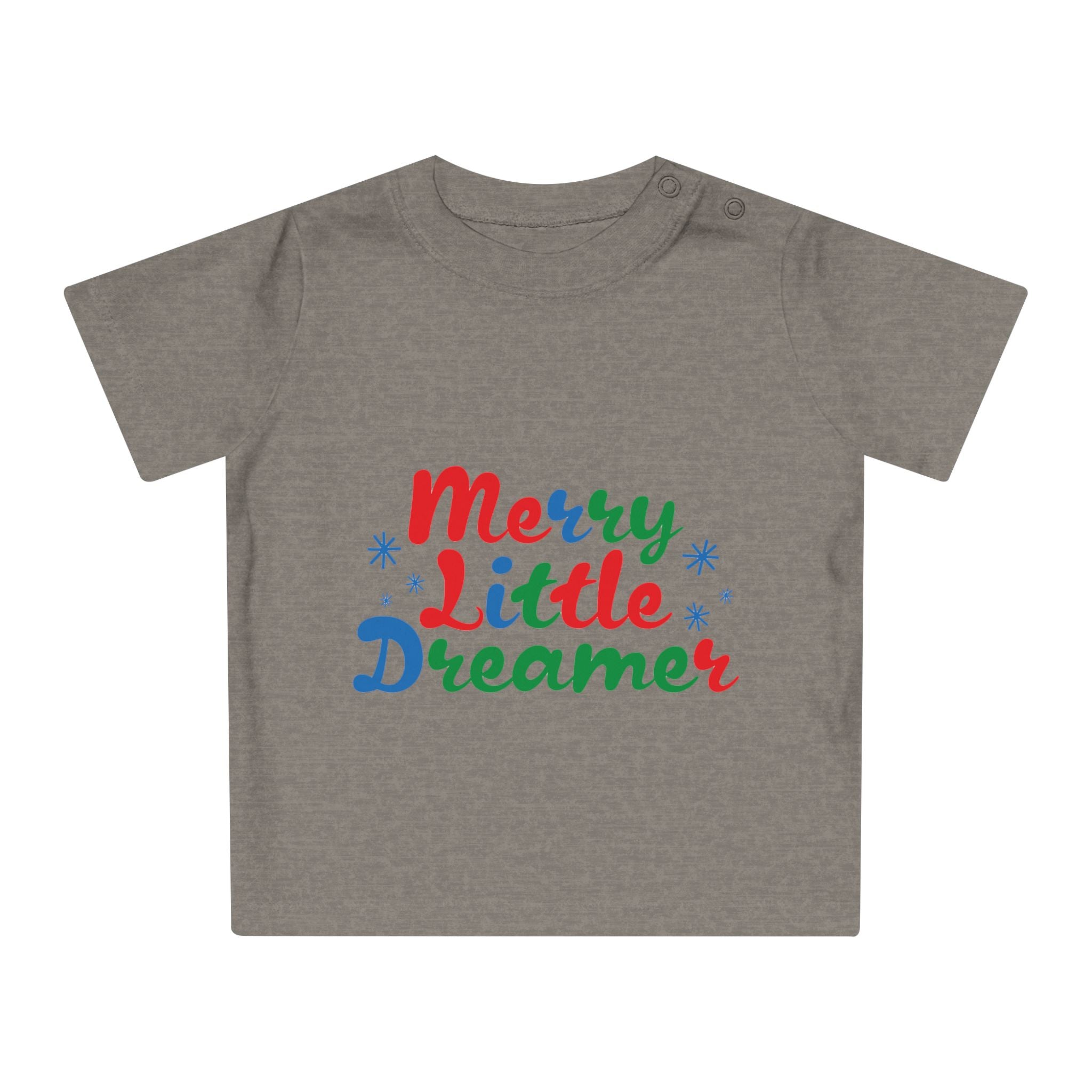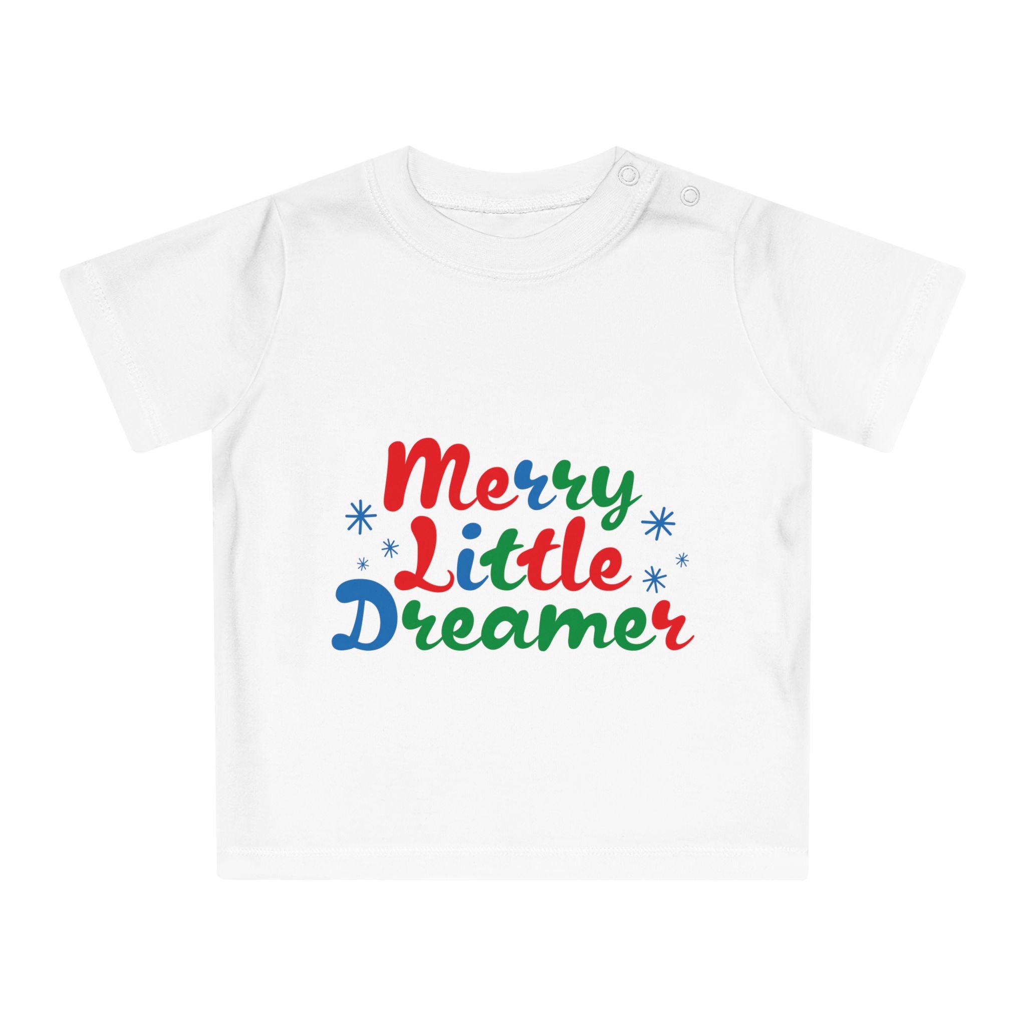 Dress your little dreamer in style with the adorable "Merry Little Dreamer" Baby T-Shirt. Perfect for everyday wear or special occasions, this soft and comfy tee is a must-have for any baby's wardrobe. The heartwarming slogan adds a touch of magic, making it the ideal outfit for spreading joy.